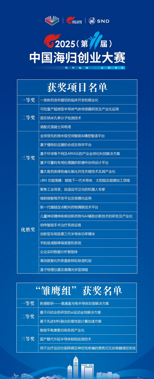 在頒獎儀式中,科技部、工信部、致公黨中央等大賽指導單位以及江蘇省、蘇州市有關部門領導為獲獎項目頒發了獎杯、獎金和證書。現場還作了中國海歸創業大賽10周年總結,全面回顧了大賽舉辦10屆以來所重點開展的工作和取得的成果;發布了中國海歸創業大賽10周年TOP100優秀企業榜單,根據歷屆參賽企業近年來在企業成長性、科技創新力、行業影響力、地區貢獻度等方面進行綜合評定,有海柔創新、青禾晶元、杉數科技、斯乾智駕、漢陽科技、識光芯科、景略半導體、圣德醫療、英磁新能源等100家優秀企業入選。此外,活動還為在大賽組織服務中作出重要貢獻、給予推動支持的一批單位頒發了中國海歸創業大賽10周年特別貢獻獎和組織貢獻獎,并舉行了中國海歸創業大賽成果轉化基地啟動儀式及項目簽約儀式。